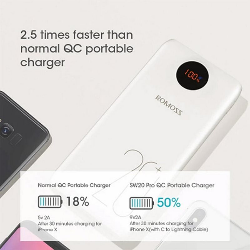 پاور بانک روموس SW20PS+ دستگاههای سازگار با فناوری شارژ سریع QC را فقط در 35 دقیقه 80 درصد شارژ می کنند که در واقع 4 برابر سریعتر از شارژرهای معمولی است. 3 خروجی USB شارژ تلفن همراه ، تبلت یا Nintendo Switch را می توانید همزمان با حداکثر سرعت تا 3 آمپر شارژر دهی کنید.
