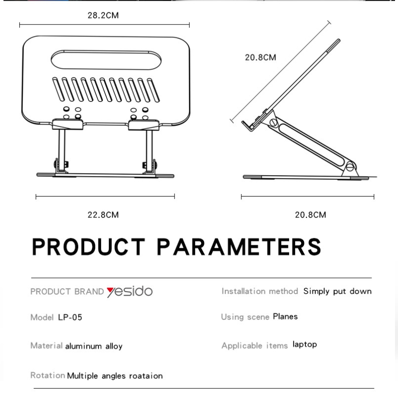استند لپ تاپ یسیدو YESIDO LP05 مقاوم از جنس آلیاژ آلمینیوم ساخته شده که میتواند لپ تاپ هایی از سایز 10 تا 17.3 اینچ و تا وزن 20 کیلو را تحمل کند. شیار های استند باعث جلوگیری از داغ شدن لپ تاپ و خراب شدن باطری میشود. پایه استند دارای قابلیت تنظیم زاویه است که طراحی ارگونومیک آن باعث کاهش آثار استفاده طولانی مدت لپ تاپ میشود. روی استند از جنس سیلیکون ضد لغزش میباشد و مانع حرکت دستگاه میشود. ابعاد این محصول 28.2×22.8 سانتیمتر است. جنس بدنه این هلدر از آلومینیوم و تاشو است.